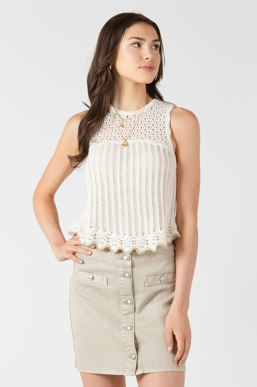 Lightweight layers just got more interesting. This sweater tank pairs an airy open-knit top with a fitted body, finished with a scalloped hem in a contrasting colour that adds unexpected flair. Perfect for layering over tees or wearing solo when the weather cooperates. The mix of textures keeps things visually dynamic while staying effortlessly wearable. By Dex.