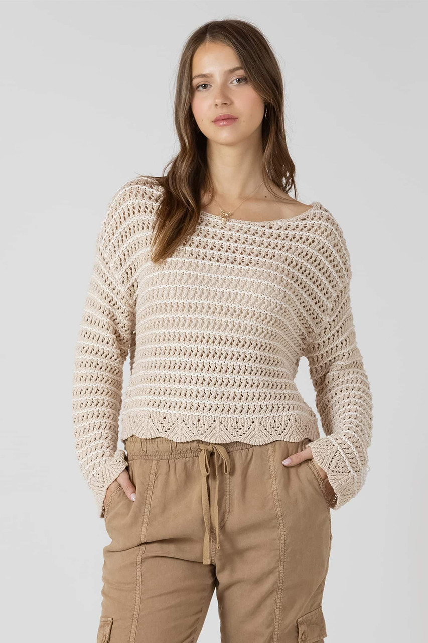 Lightweight and breezy, this open knit sweater keeps you cool when the temperature climbs. Long sleeves offer gentle coverage without the bulk, while the scalloped hem adds a touch of whimsy to your summer rotation. Perfect for layering over a tank or wearing solo on those perfect-weather evenings. Effortless style that breathes as well as you do. By Dex.