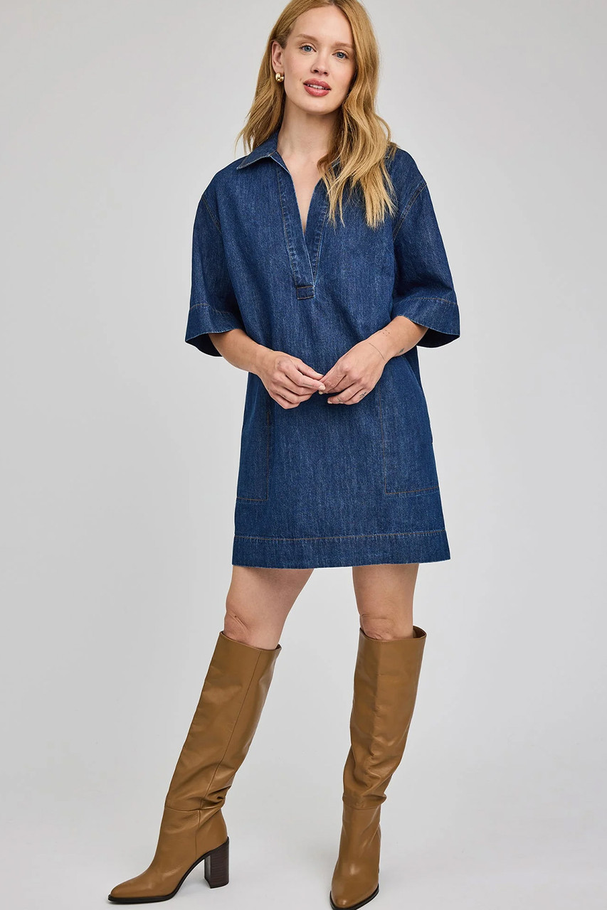 The Evelina dress is made of a denim fabric that has been specially washed for a perfectly lived-in look. Features include a collar with a v-neckline and side seam pockets. By Gentle Fawn.