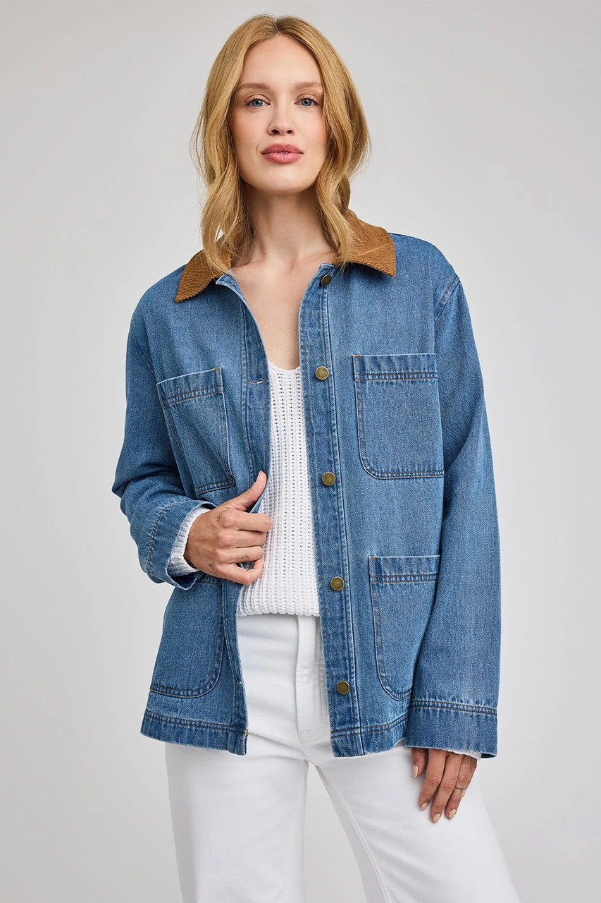 The Flynn jacket is made of a heavy weight denim fabric that has been specially washed for a perfectly lived-in look. The effortless silhouette features patch pockets and a contrast corduroy collar. By Gentle Fawn.