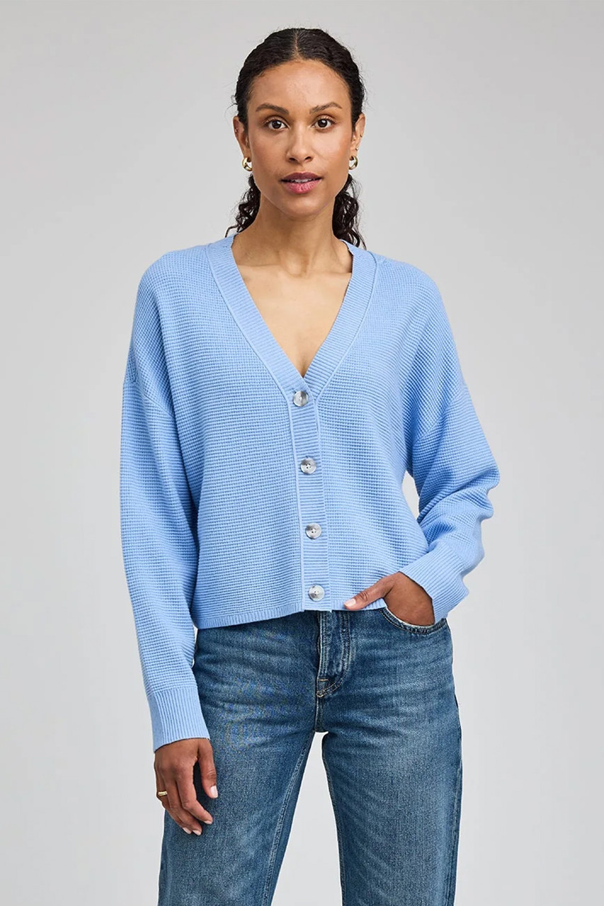 The Joyce cardigan is made of a soft yarn in a waffle stitch pattern. Features include a front button closure and exposed seam details. By Gentle Fawn.
