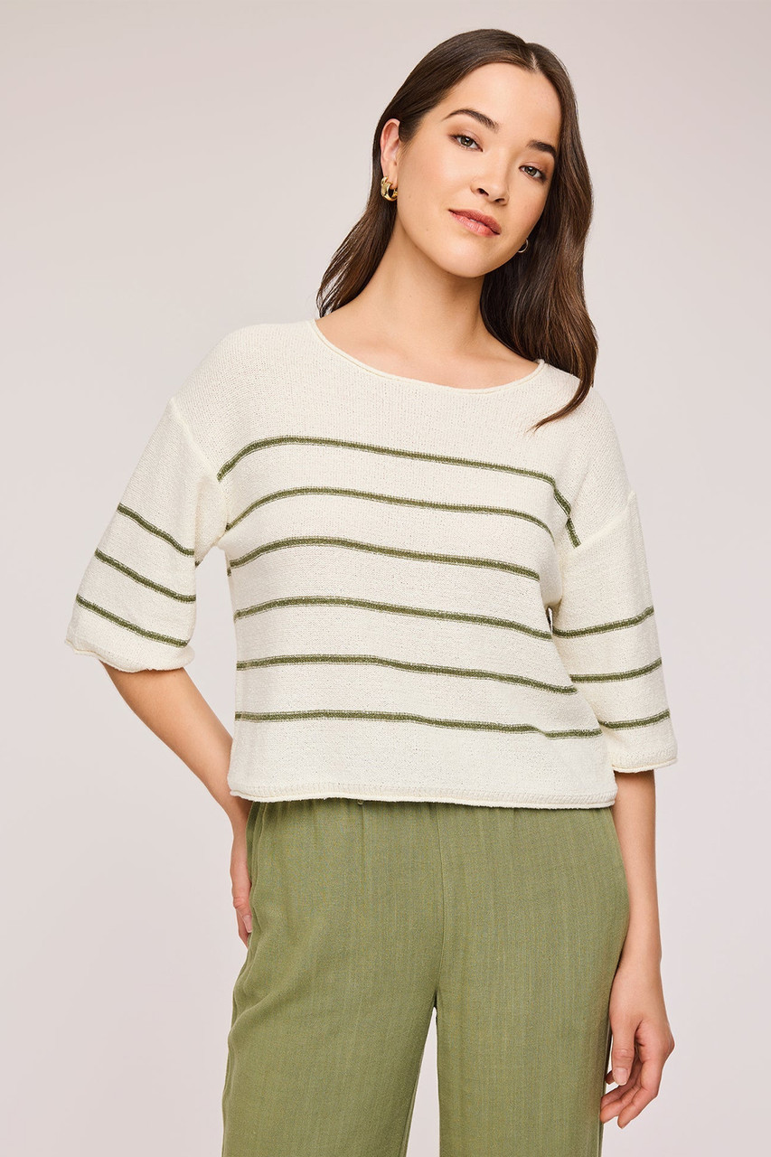 The Kerrigan sweater is made of a yarn with a slub effect in a reverse jersey stitch. Features include a narrow stripe and rolled hem details for a casual feel. By Gentle Fawn.