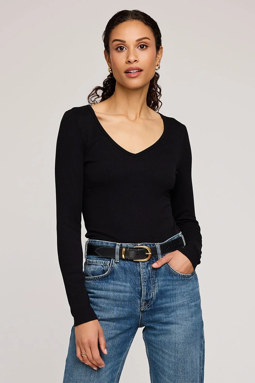The Petra top is made of a stretchy ribbed fabric that hugs the body. The effortless v-neckline is perfect for everyday wear or dressed up. By Gentle Fawn.