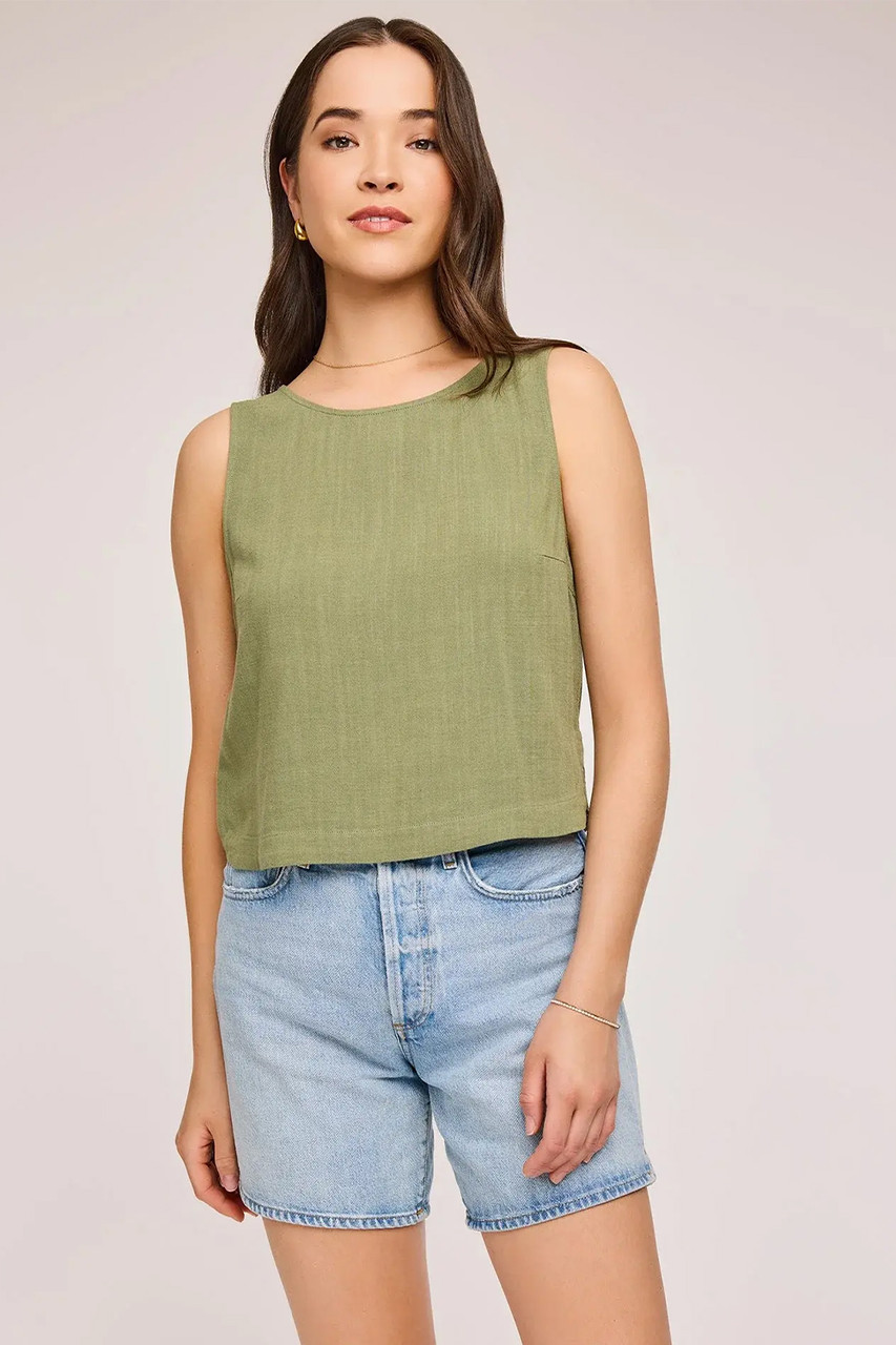 The River tank is made of a linen blend fabric for an effortless look and feel. Features include a curved hem detail and back button closure. Complete the look with the Amalfi short or Finley pant. By Gentle Fawn.