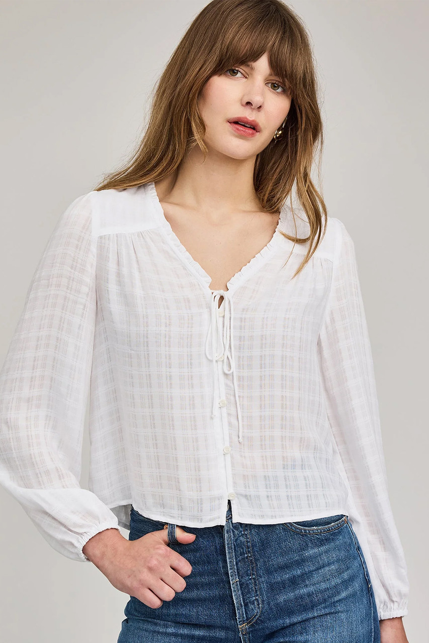 The Vanessa top is made of a textured plaid fabric. Features include a button front closure and v-neckline with delicate ruffle detailing. By Gentle Fawn.