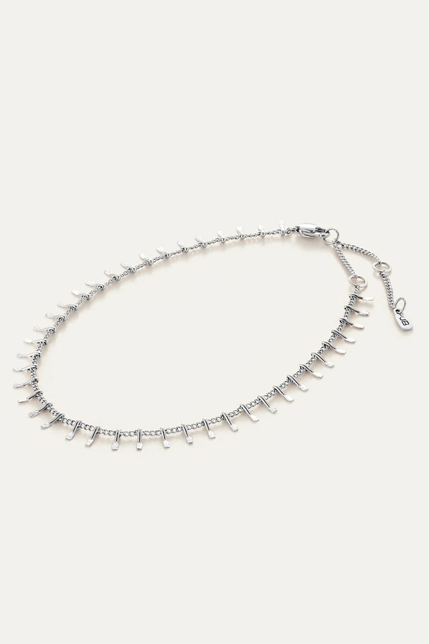 A series of micro stamped elements dangle from a detailed curb chain, catching the light beautifully. The water-resistant Lumi Anklet includes three non-removable extender rings, making it easy to adjust to your ideal length. Finished in high-polish silver. By Jennybird.
