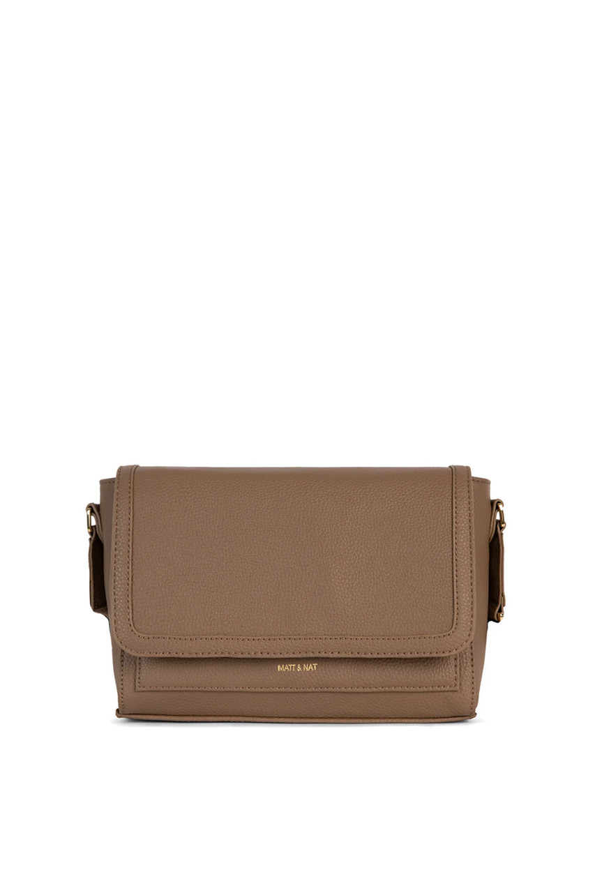 A crossbody bag with a flap closure and an adjustable strap that can be shortened to wear as a shoulder bag, a front slip pocket, and a large internal zip pocket. By Matt & Nat.