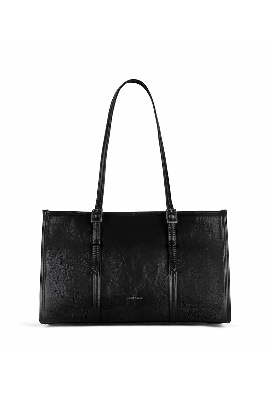 Satchel with a top zipper closure, functional buckles at handles to adjust the length, and internal pockets. By Matt & Nat.