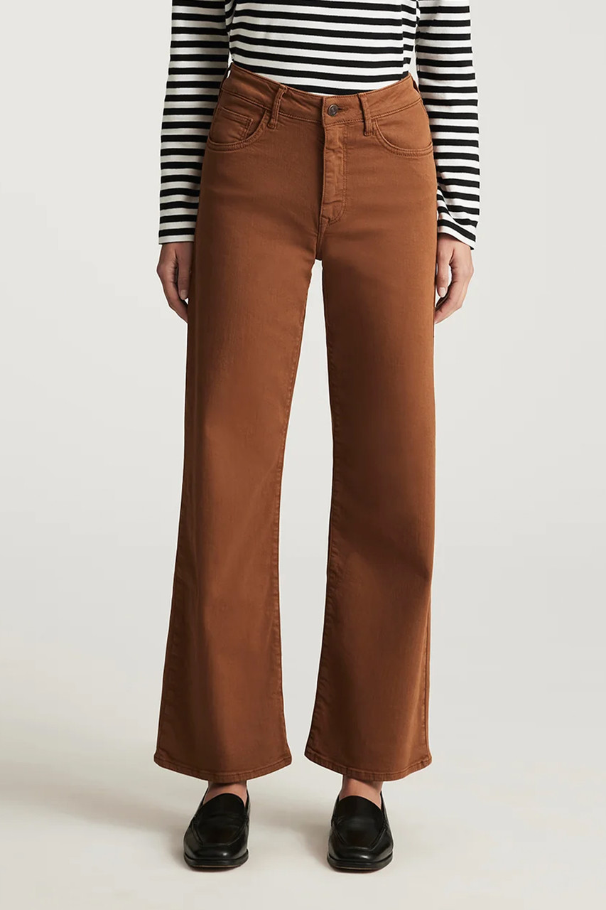 A wide leg with a comfortable mid rise, Alena is an effortlessly flattering style. Relaxed from hip to hem, it’s easy to dress up or down, making it the ideal everyday pair. This pair comes in a camel shade with golden undertones. By Mavi.