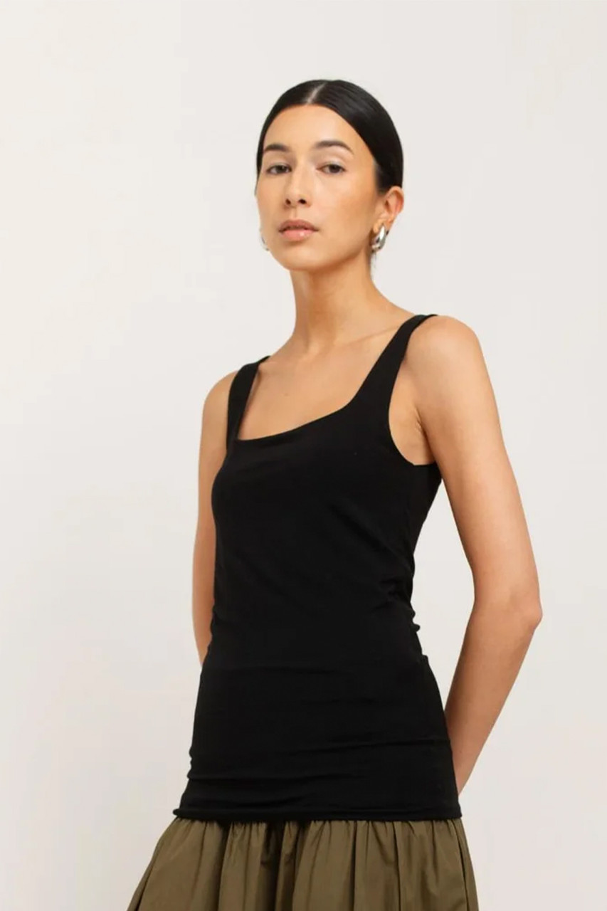 Thanks to its double-layered design, you can skip the bra if you prefer and still enjoy the support of a tank that truly does it all. Wear it as is for a sleek, laid-back vibe or flip it around for a higher neckline when extra coverage is what you’re after. With its minimalist design and endless styling options, the Alina Tank is your ultimate go-to for comfort and effortless style. By Paper Label.