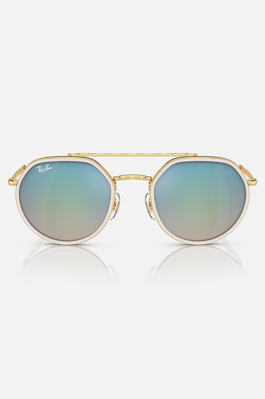 Ray-Ban RB3765 sunglasses feature an irregular gold metal frame with blue gradient-mirror lenses. The polished gold metal adds a touch of luxury to the overall design, making these sunglasses a stylish choice for any occasion. By Ray-Ban.