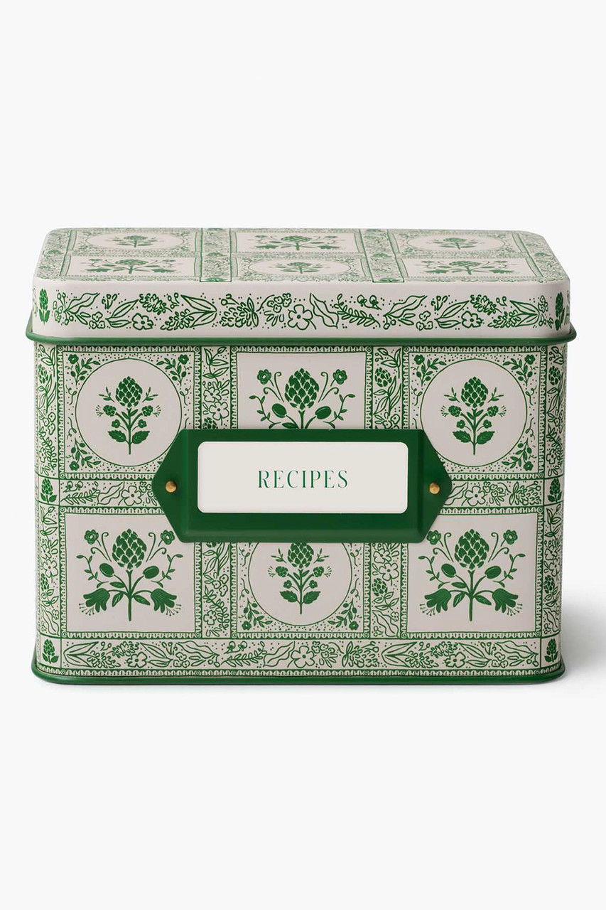 Never lose a family recipe with our charming recipe tins. Holding up to 200 recipe cards, the countertop organizers feature printed illustrations, a gold metallic interior, and a gold-framed label, as well as 24 included recipe cards and 12 recipe dividers. By Rifle Paper Co.