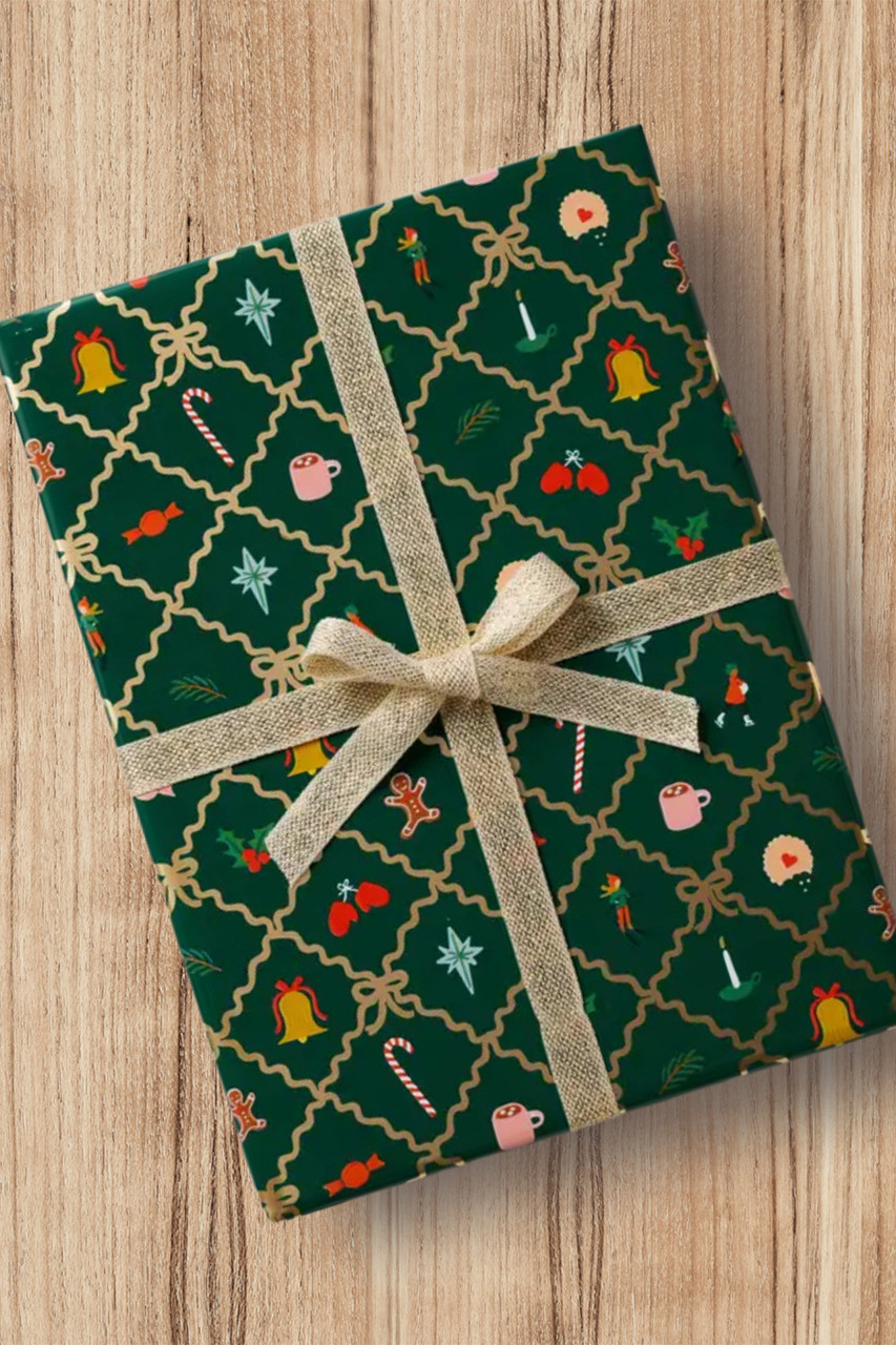 Dress up your presents with this beautiful printed wrapping paper from Rifle Paper Co., featuring 8 feet of festive illustrations, gold foil accents, and gridlines on the back. By Rifle Paper Co.