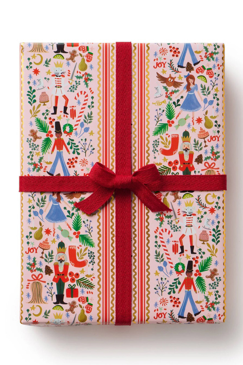 Dress up your presents with this printed wrapping paper, featuring 8 feet of Nutcracker-inspired illustrations, gold glitter foil, and gridlines on the back. By Rifle Paper Co.
