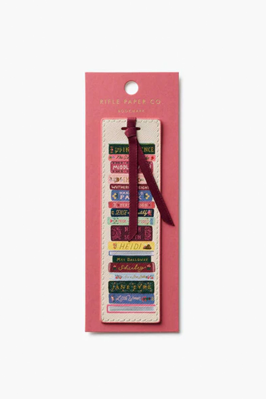 Never lose your spot with our illustrated Ladies Night Book Club bookmark, featuring a stack of classic titles and a grosgrain ribbon tie. By Rifle Paper Co.