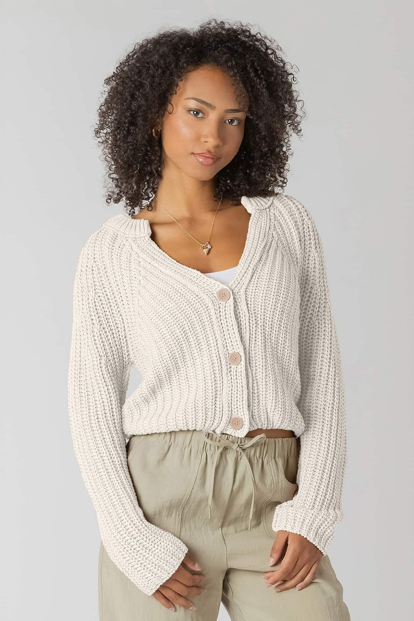 Throw on this textured knit cardigan and instantly level up your layering game. The cropped silhouette pairs perfectly with high-waisted jeans or skirts, while oversized decorative buttons add a fun, statement-making touch. Long sleeves keep you cozy, and the flattering V-neck creates an effortless, put-together vibe. A versatile piece that works as hard as you do—whether you're heading to brunch or the office. By Room 34.