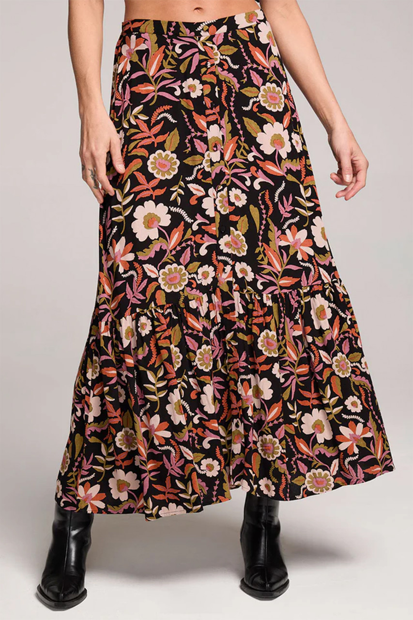 The Carli Maxi Skirt features a full, tiered design that flares into a dramatic wide bell silhouette. By Saltwater Luxe.
