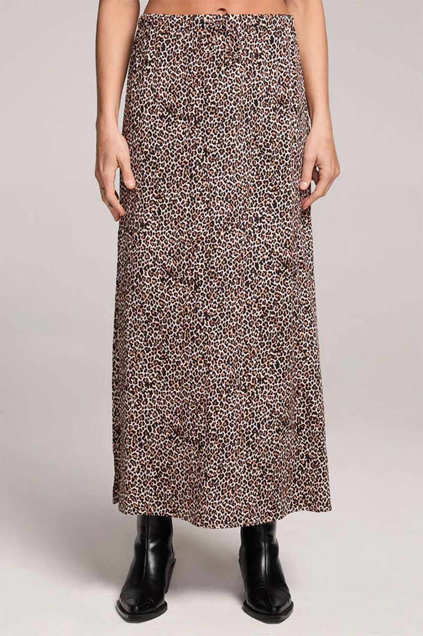 The Seraphyne Leopard Midi Skirt is a timeless piece with a simple silhouette and subtle textured gathering at the waistline for a refined touch. By Saltwater Luxe.